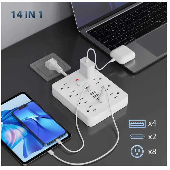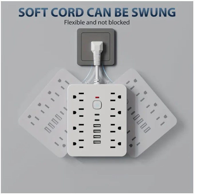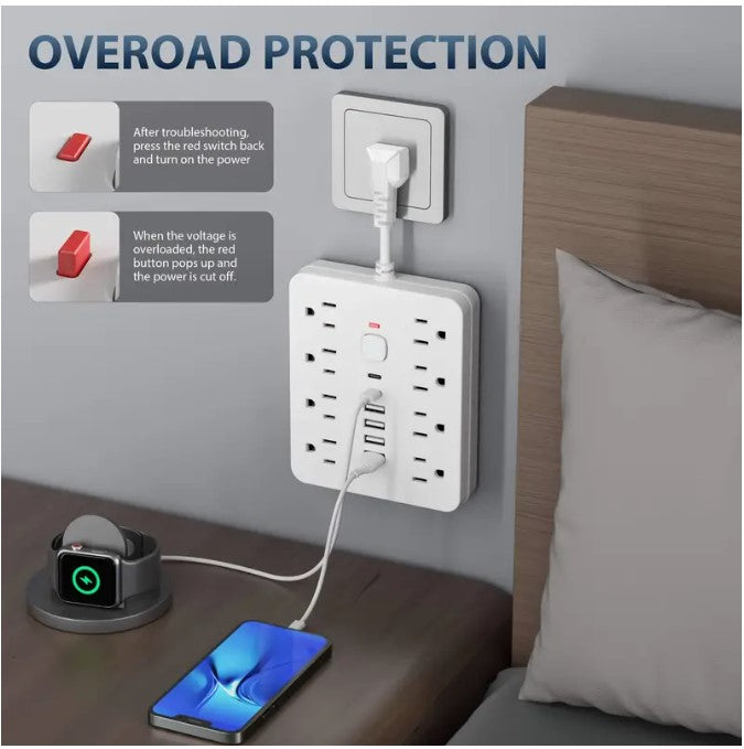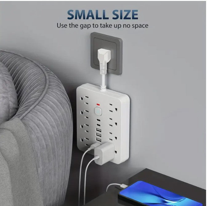 Introducing our 6-Outlet Wall Plug Surge Protector. Safely power up to 6 devices at once with its hexagon shape and on/off switch for easy control. Its mountable design allows for convenient placement in any room. Protect your electronics with confidence.
