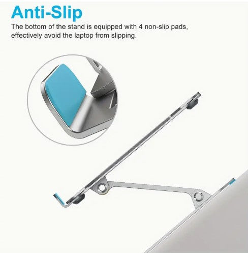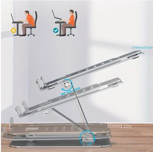 Improve your work posture and cooling with this adjustable aluminum laptop stand. Portable, foldable, and made of durable aluminum alloy, it's compatible with various laptop sizes, making it perfect for all your devices. The anti-skid silicone and sleek design ensure stability and a clutter-free desktop, ideal for travel or everyday use.