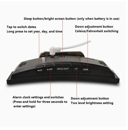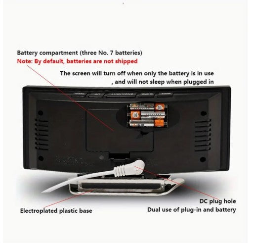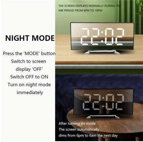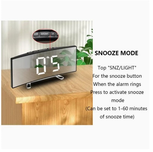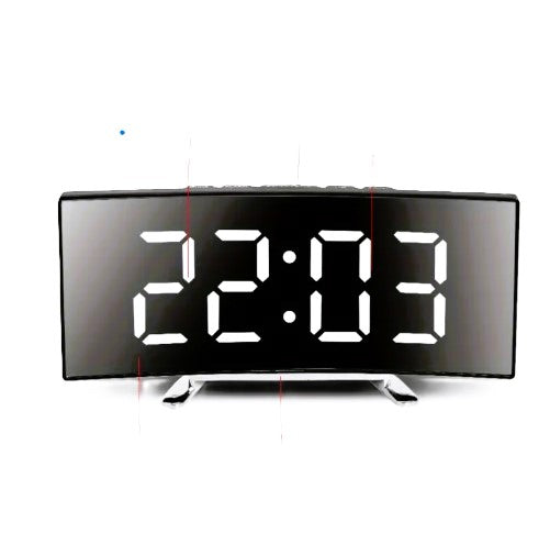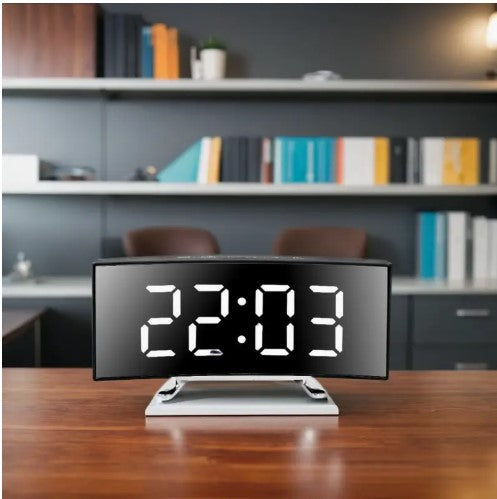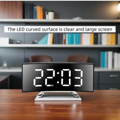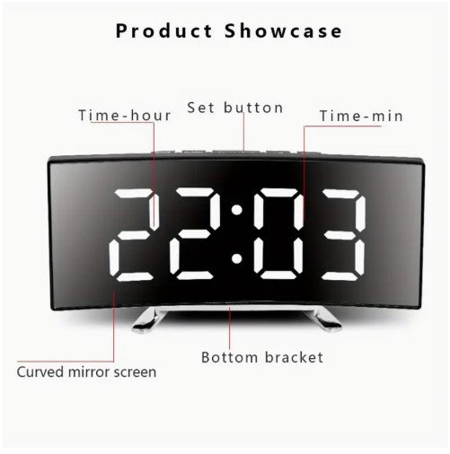 Introducing our Alarm Clock, featuring a sleek LED curved screen display. Enjoy a silent night with our desktop clock, perfect for any home or office decor. With USB rechargeable capabilities and easy time & date switching, this clock is a must-have. Upgrade your space this Christmas!
