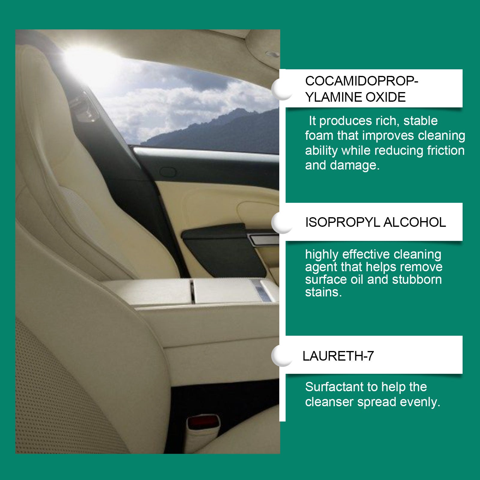Ingredients: deionized water, isopropyl alcohol, propanediol butyl ether, lauryl alcohol polyether-7, coconut oil amidopropyl amine oxide