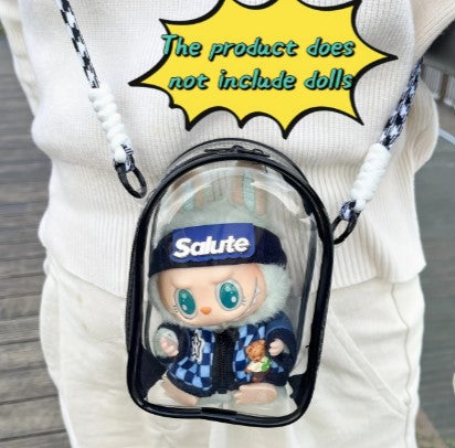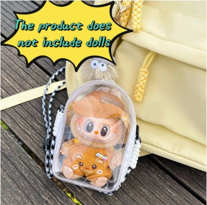 The Labubu Vinyl Sitting Party Crossbody Bag features a 5.91-inch multi-color transparent PVC design with a playful cartoon motif. Its adjustable strap ensures a comfortable fit, while the secure zipper closure keeps essentials safe and accessible. This compact bag is ideal for carrying daily necessities with a stylish, fun twist.