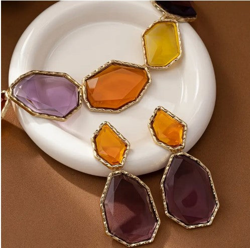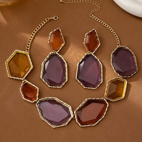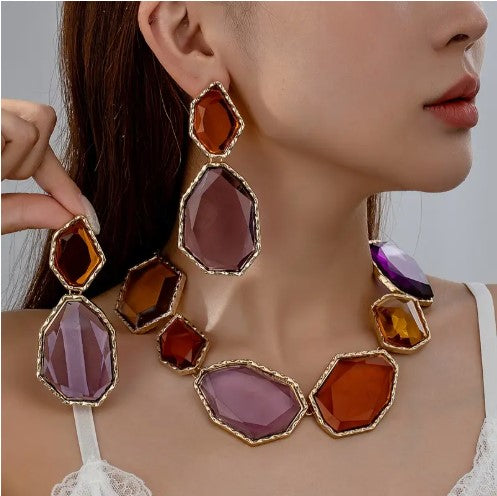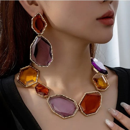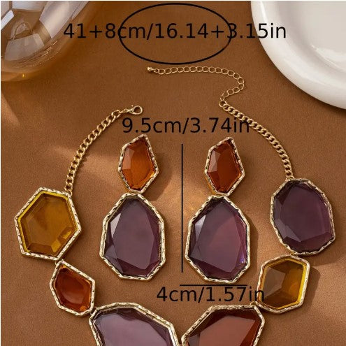 Luxury 18K Golden Plated Jewelry Set - Geometric Statement Necklace and Earrings with Colorful Plastic Gemstones, Zinc Alloy - Ideal for Wedding, Party Accessory - Versatile All-Season Fashion Ensemble