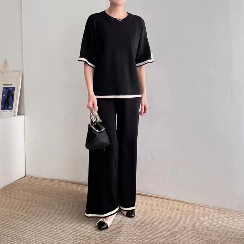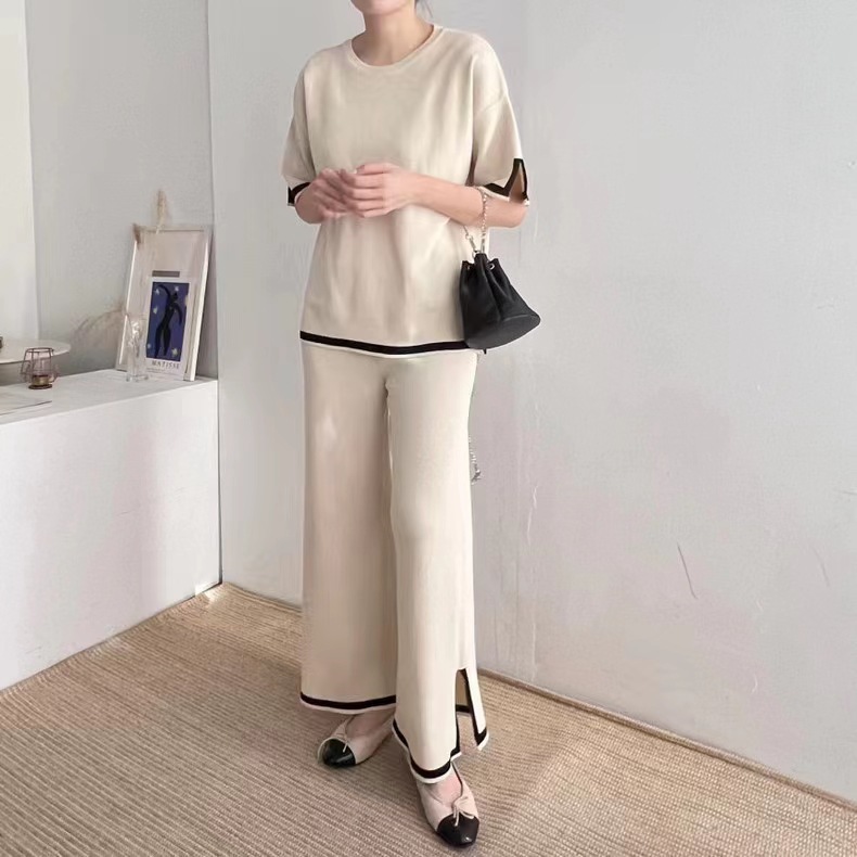 Fashionable Contrasting Color Slit Short-sleeved Sweater + High-waist Slimming Wide-leg Pants 2 piece Set