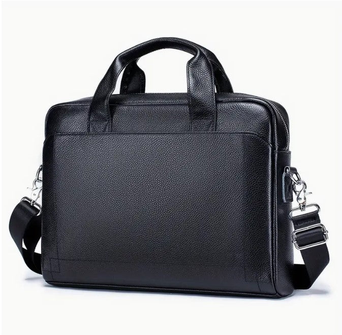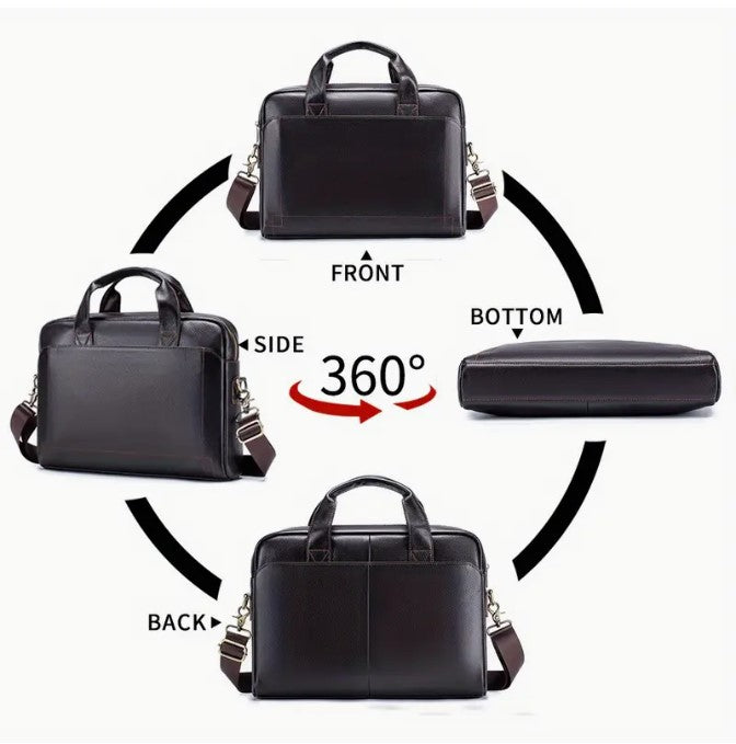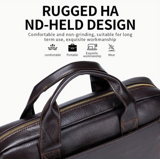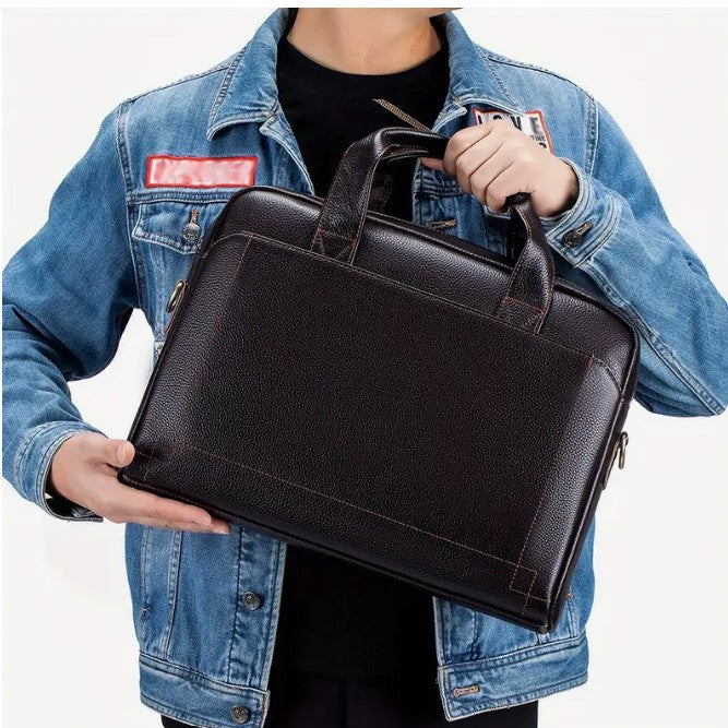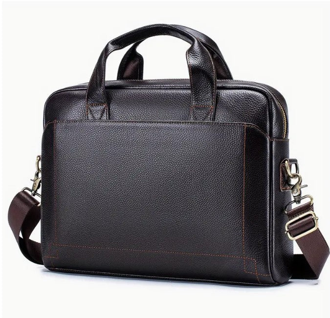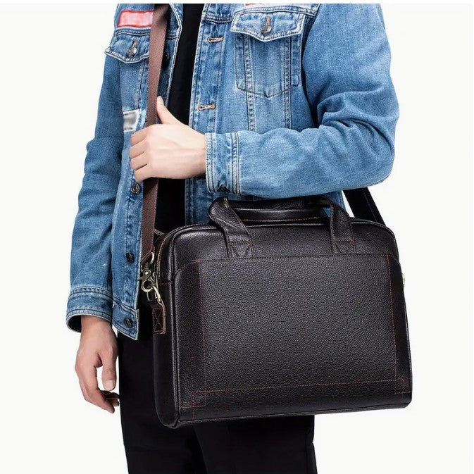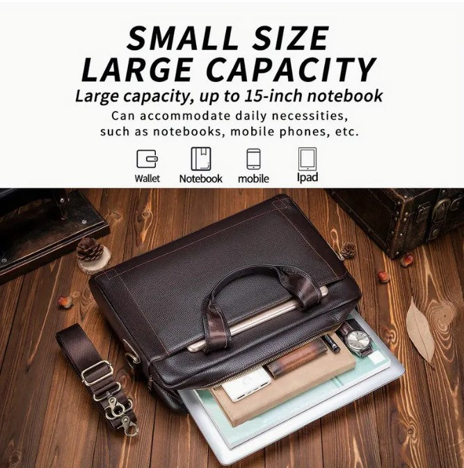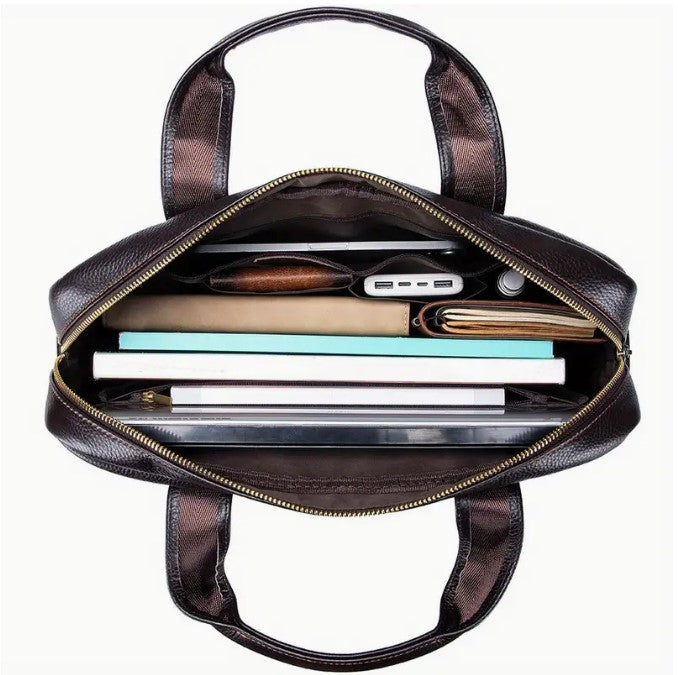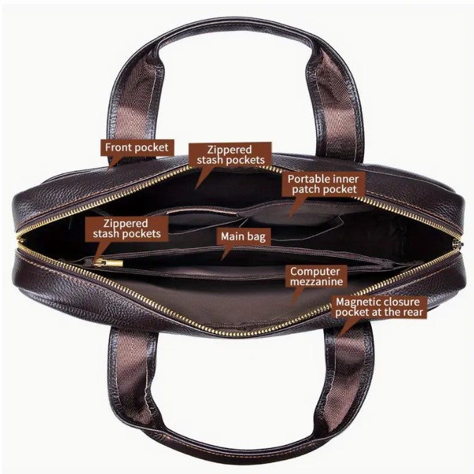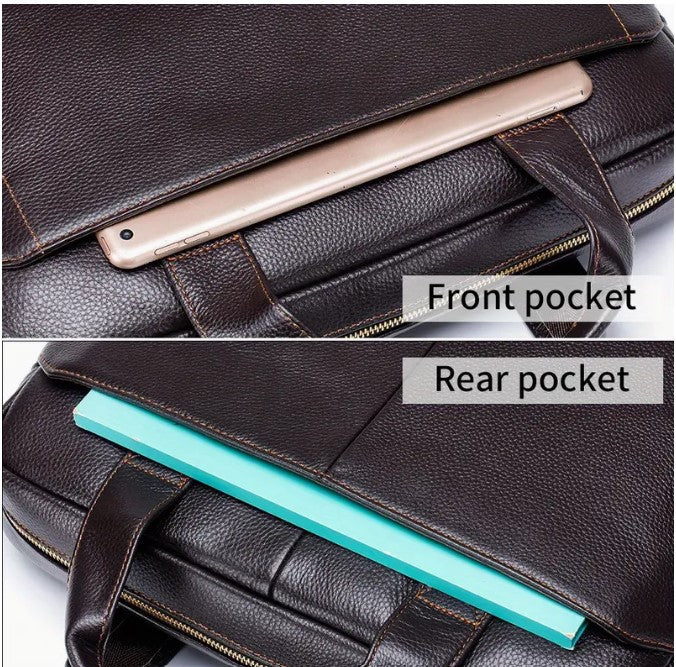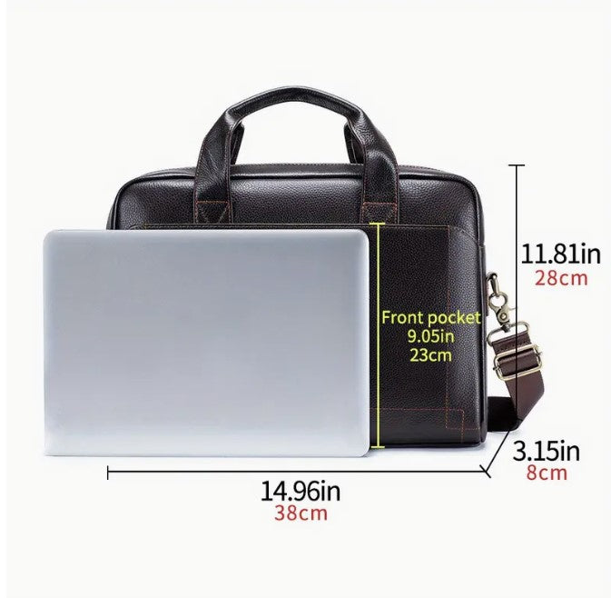Expertly crafted with premium genuine leather, our 15-inch laptop briefcase is perfect for business travel. Designed with multiple compartments, a zippered pocket, and a shoulder strap, it combines style and functionality. Keep your laptop safe on the go with this dark brown, stylish and durable laptop bag.